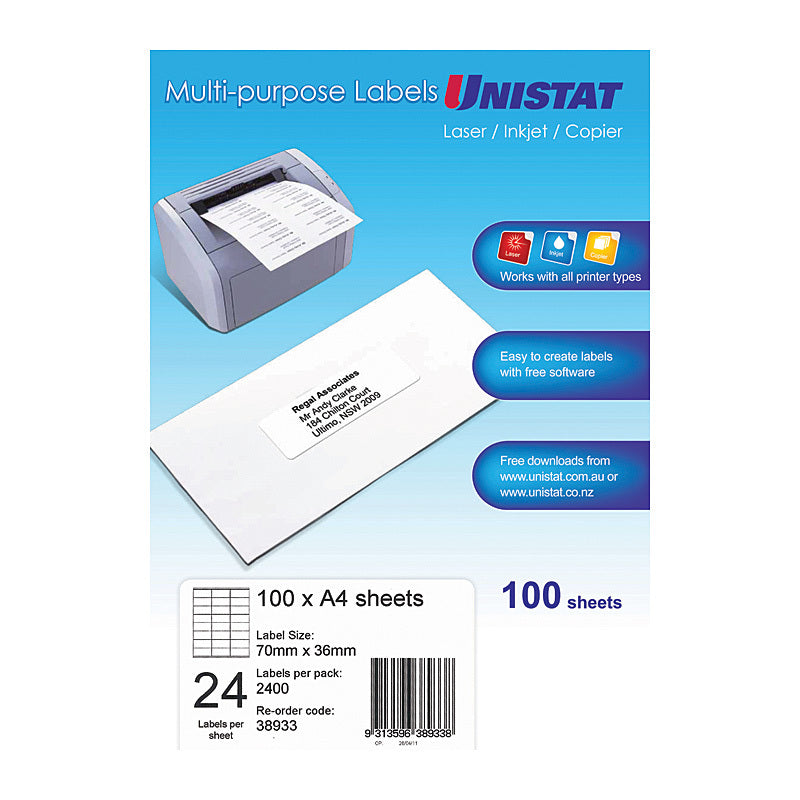 Unistat LIP Label LIP 24Up 70X36mm Bx100 are ideal for addressing and other applications. Suitable for laser printers, inkjet printers and copiers. Self-adhesive ensures labels stay secure. Natural white finish.